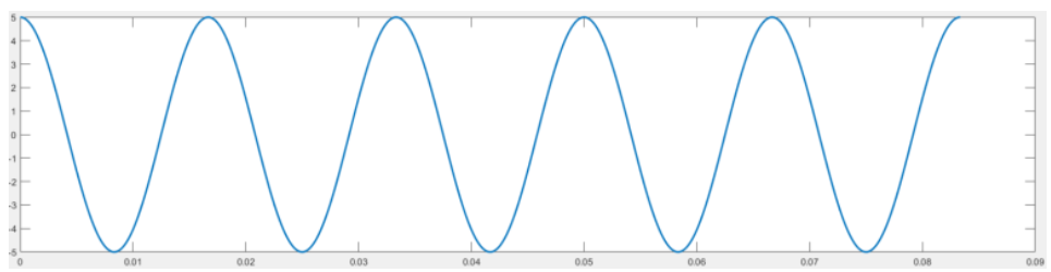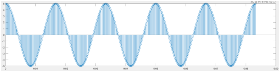 위 신호는 5cos(2*pi*60*t)이고, 시간(x축)과 크기(y축)이 연속적이고, 어느 한 점을 지정하더라도 그 시간과 크기를 숫자 하나로 확정할 수는 없을 것이다.