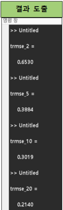 RMSE(평균 제곱근 편차) : 추정 값 또는 모델이 예측한 값과 실제 환경에서 관찰되는 값의 차이를 다룰 때 흔히 사용하는 측도이다. 사각펄스와 푸리에 급수로 표현된 펄스의 평균 제곱근 편차를 구하는 실습이었다. 최대 차수를 늘릴수록 기존 파형과 비슷한 파형이 나오기 때문에 차수를 늘릴수록 오차도 줄어야할 것이다. 사각펄스를 만들기 위해 ones와 zeros를 사용하여 배열을 만들고 합쳤다. 3주기만큼의 펄스를 만들었기 때문에 1주기의 RMSE를 만들고 3을 곱해주었다. 사각펄스(x)와 푸리에급수로 표현된 펄스(ft)를 선언하고 두 값 차이의 제곱을 d(i)로 저장한 후에 그 값을 sum하고 한 주기의 sample값인 3000으로 나눠주었다. 최종적으로 이 값에 루트를 씌워 RMSE값을 도출하였다. 실제로 최대차수를 2, 5, 10, 20 으로 늘려감에 따라 RMSE 값이 감소하는 것을 확인할 수 있었다.