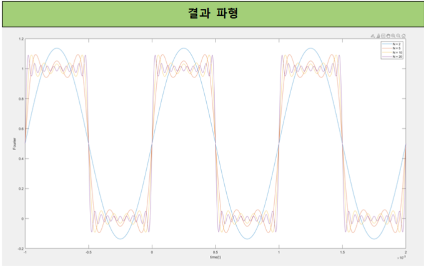 푸리에 급수로 표현을 할 때 최대 차수 설정을 바꿔가면서 파형을 도출하는 실습이었다. 사각펄스 함수를 푸리에 급수로 표현을 하고 차수를 늘려감에 따라 비교분석을 해보았다. 차수가 낮을 때는 표현되는 주파수 성분이 적어 원래의 함수 파형과는 많이 다른 모습이었다.