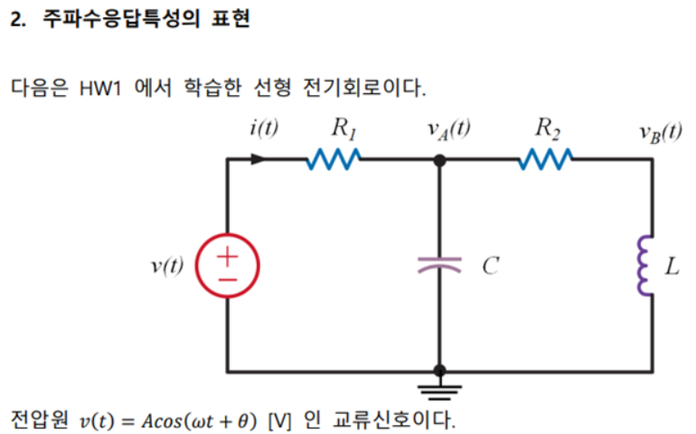 위의 A 번의 주파수 응답특성에 대한 결과값으로부터 HW1-A 에서 얻은 vA(t), vB(t) 파형을 설명해보시오. v(t)의 주파수를 바꾸는 경우 vA(t), vB(t) 의 peak 값이 최대가 되는 주파수를 구해보시오.