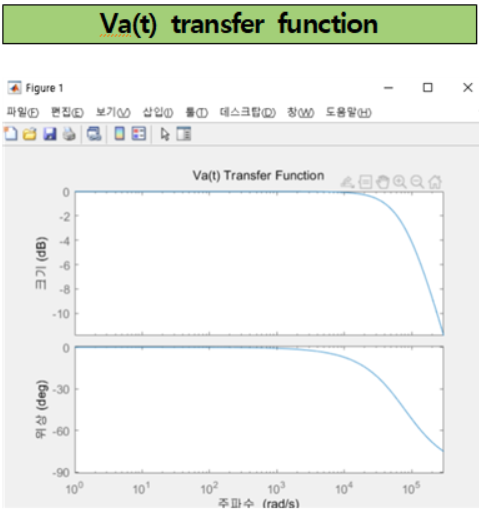bodeplot을 이용하여 주파수영역에서 전달함수의 특성을 확인해보았다. Va(t)의 전달함수의 경우 크기가 1에서 점점 감소하는 파형이다. 특정 주파수에서 전달함수의 감소 특성으로 Va(t)가 V(t)보다 더 작아졌음을 확인할 수 있었다.