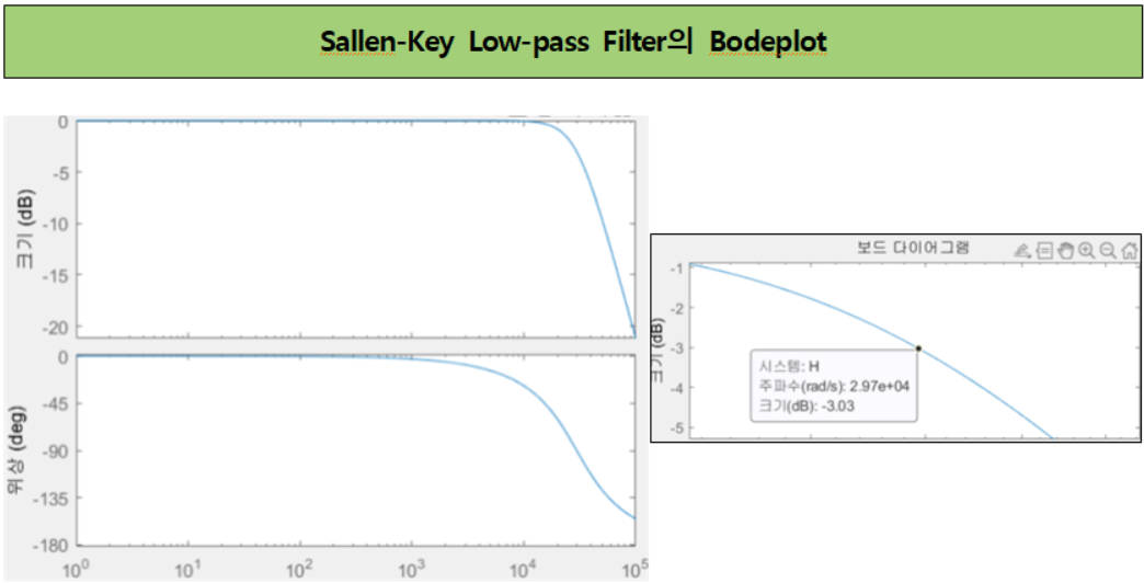 차단 주파수가 30KHz가 되도록 소자의 값을 설계한 후 전달함수를 구하고 0~100KHz영역에서 Bode Plot을