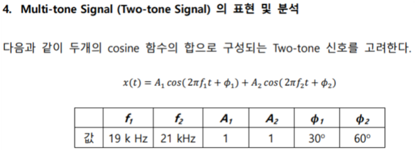 x(t)는 two-tone signal로 2개(19MHz, 21MHz)의 주파수 성분을 포함하고 있다. 이 신호가 비선형 시스템을 거치게 되면 입력신호의 주파수의 선형 합으로 주파수 성분이 발생한다.