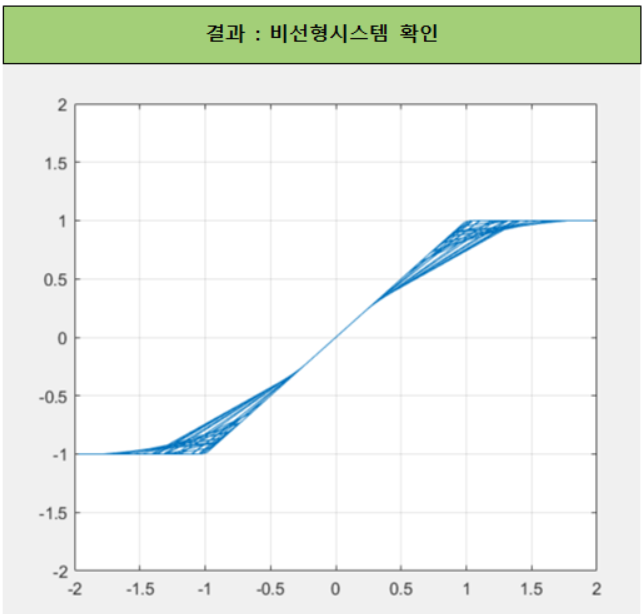 문제에서 소개된 비선형시스템은 다음과 같다. 입력 값이 –1보다 작다면 출력 또한 –1이 되고, 1보다 크다면 출력 또한 1이 된다. [-1, 1]에서는 선형시스템으로 입력 값에 대해 그대로 출력이 나온다. 이것이 limiter의 성질이다.