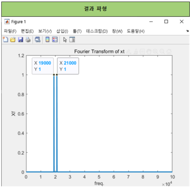 위의 신호를 매트랩을 이용하여 시간영역에서 표현하기 위해 샘플링 주파수를 200KHz로 설정하였고,
