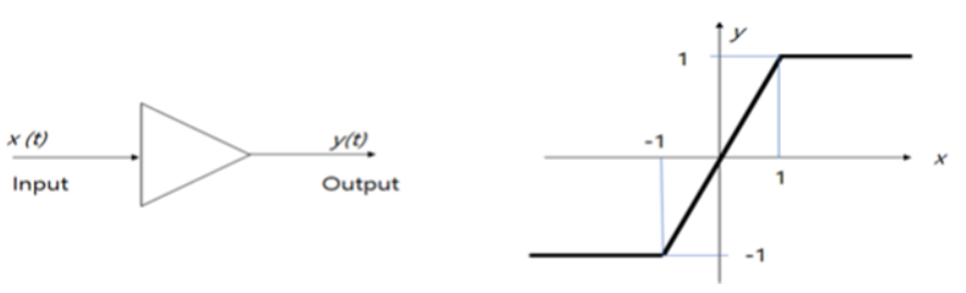 입력된 x(t)는 다음과 같이 최대크기 2, 최소크기 –2를 갖는 주기신호이다. 이 신호가 다음과 같은 limiter를 거쳐서 출력되면 위 그래프와 같이 크기가 [-1, 1]사이의 값들만 x(t) 그대로 출력되게 된다.