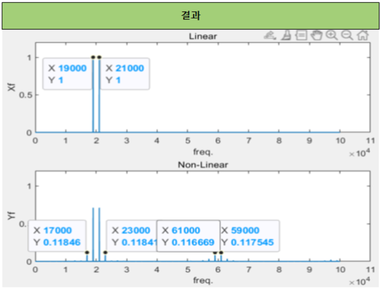 위에 결과로 확인을 해본다면 w1을 19MHz, w2를 21MHz로 가정하겠다. 우선 17000Hz와 23000Hz가 w1과 w2의 inter-modulation으로 인한 주파수임을 확인할 수 있다.