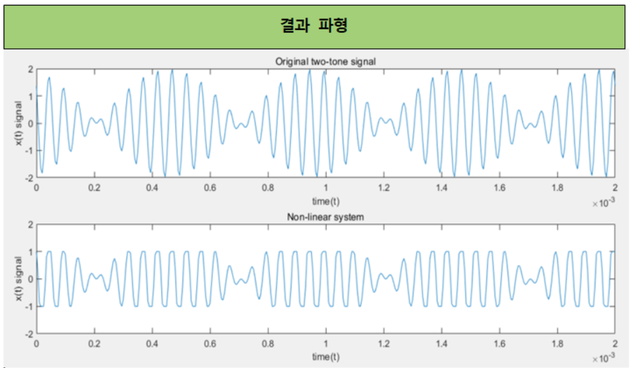 Two-tone signal인 x(t)가 비선형시스템을 거쳐서 나오는 출력 y(t)를 확인하는 실습이었다.