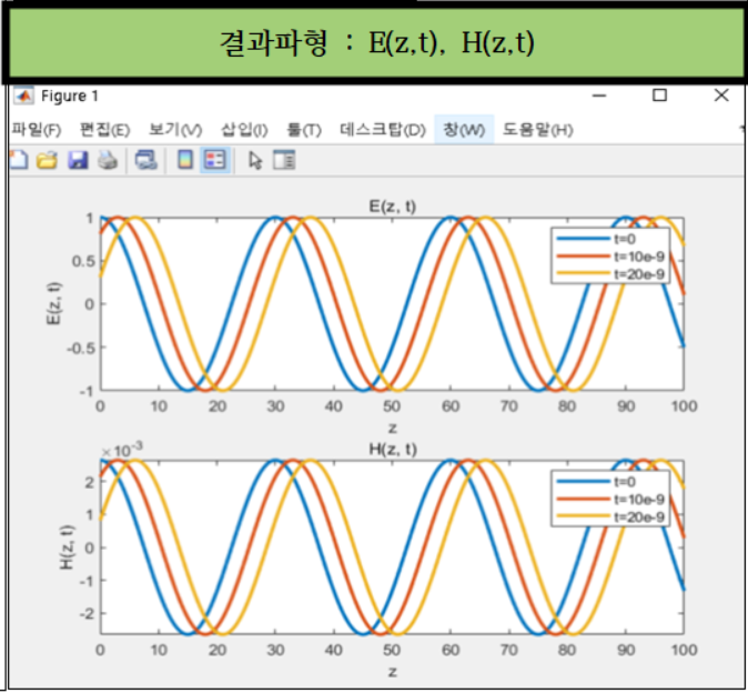 z를 0에서 100m의 구간에서 f = 10MHz 경우에 대해서 t = 0, t = 10nsec, 20nsec일 때의 E(z, t)와