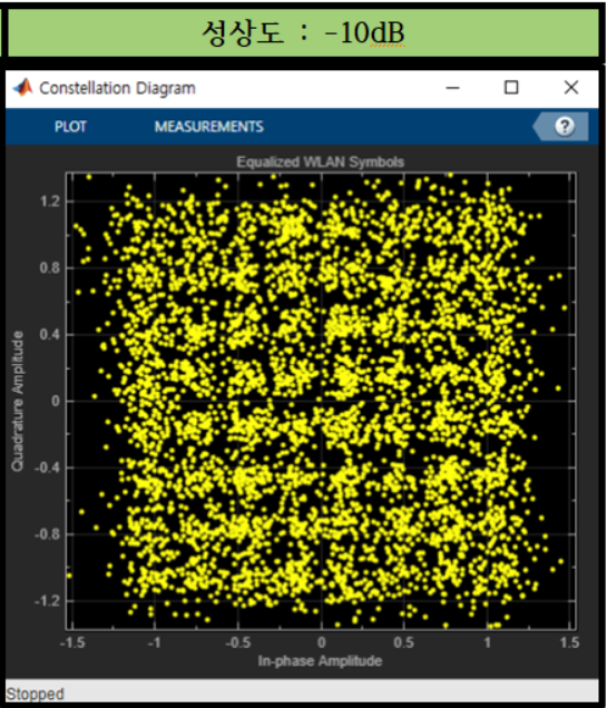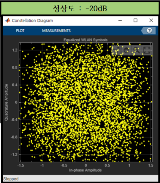 하지만 tx.gain을 낮출수록 역시 power spectrum density 결과파형의 값이 낮아 졌고, 성상도에서는 I/Q가 제대로 찍히지 못하는 것을 확인했다. 또한 수신단에서 사진이 확인이 안되는 것으로 보아 통신이 제대로 이루어지지 않았음을 알 수 있다.