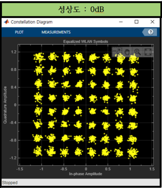 tx.gain이 0dB였을 때는 원 신호를 거의 그대로 다 송신하기 때문에 power spectrum density 결과파형이 약 ‘-110dBm/Hz ~ -70dBm/Hz’사이에서 도시되었다. 또한 성상도에는 64QAM 이기 때문에 64개의 점에 좌표가 찍히는 것을 확인할 수 있었고, 수신단에서 사진이 보내진 것을 관측할 수 있었다.