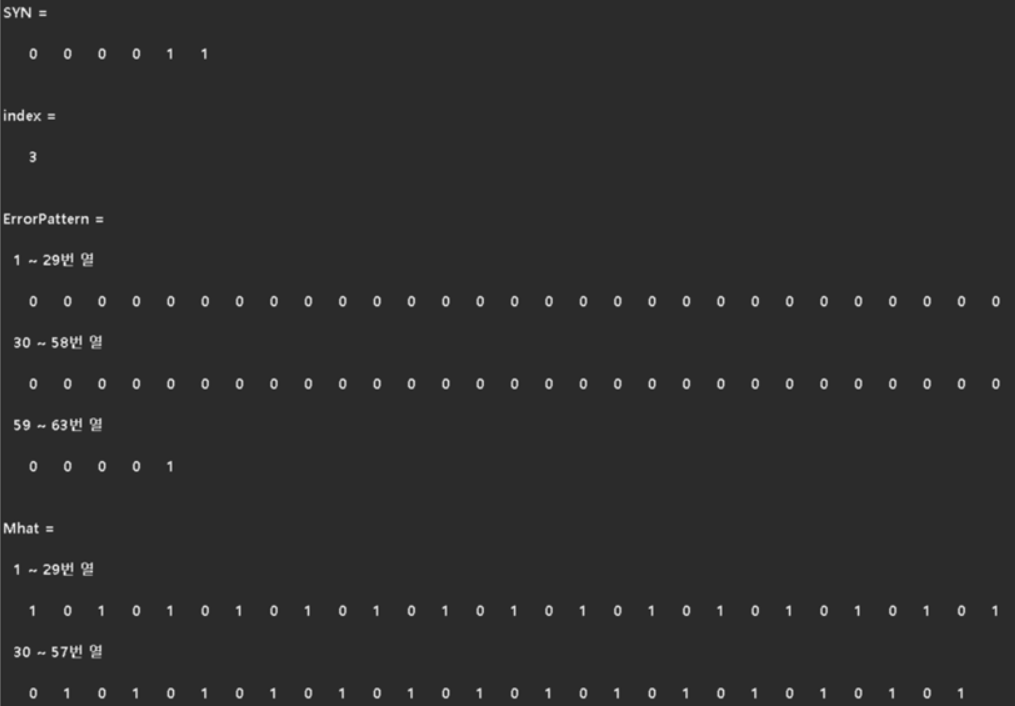 실제로 출력되는 값들은 정의했던 [10101····]만이 K개 만큼 출력되었다. 신드롬 테이블을 확인해보았을 때 index에서 1을 더한 값이 Error Pattern이 작업공간에 저장되어있는 것도 확인할 수 있었다.