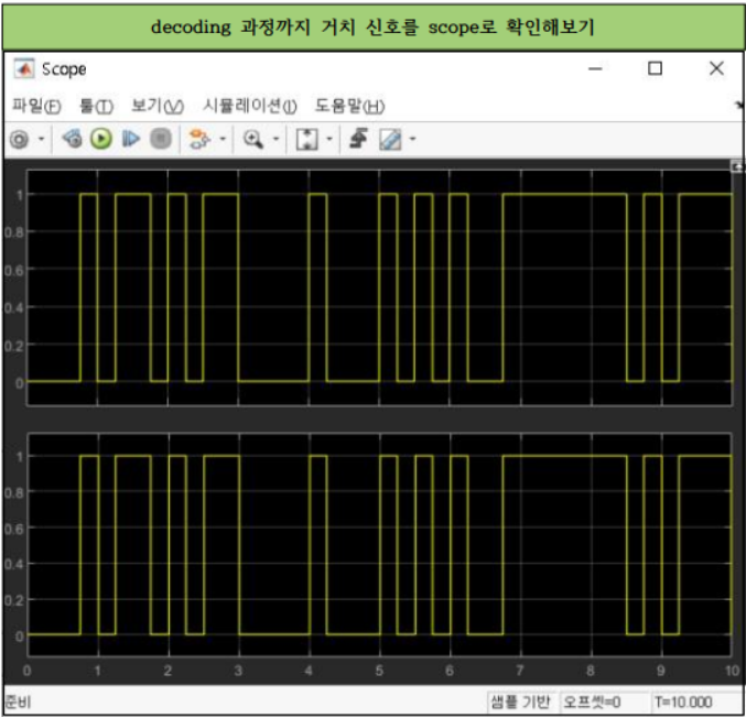 ‘Bernoulli Binary’를 사용하여 임의의 신호를 생성해주고 내가 정의한 인코딩 함수를 거치게 한다. 이후 noise가 있는 채널을 통해 신호 가 이동하여 수신 단 쪽인, 디코딩 부분으로 넘어가게 된다. 이때, 우리는 오류를 검출, 정정하기 위해 매트랩 함수를 작성했으므로 error가 발생할 확률은 거의 없다. 실제로 10000초 동안 실행시켜 40000bit를 생성시켰을 경우, 스코프를 통해 확인해보니 0에 가까운 값이 도출되었고 인코딩을 거치지 않은 신호는 인코딩을 거친 신호의 11배 정도의 BER을 확인할 수 있었다.